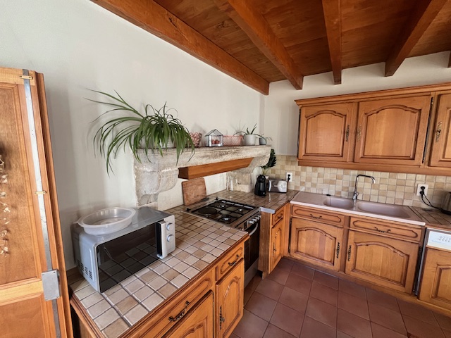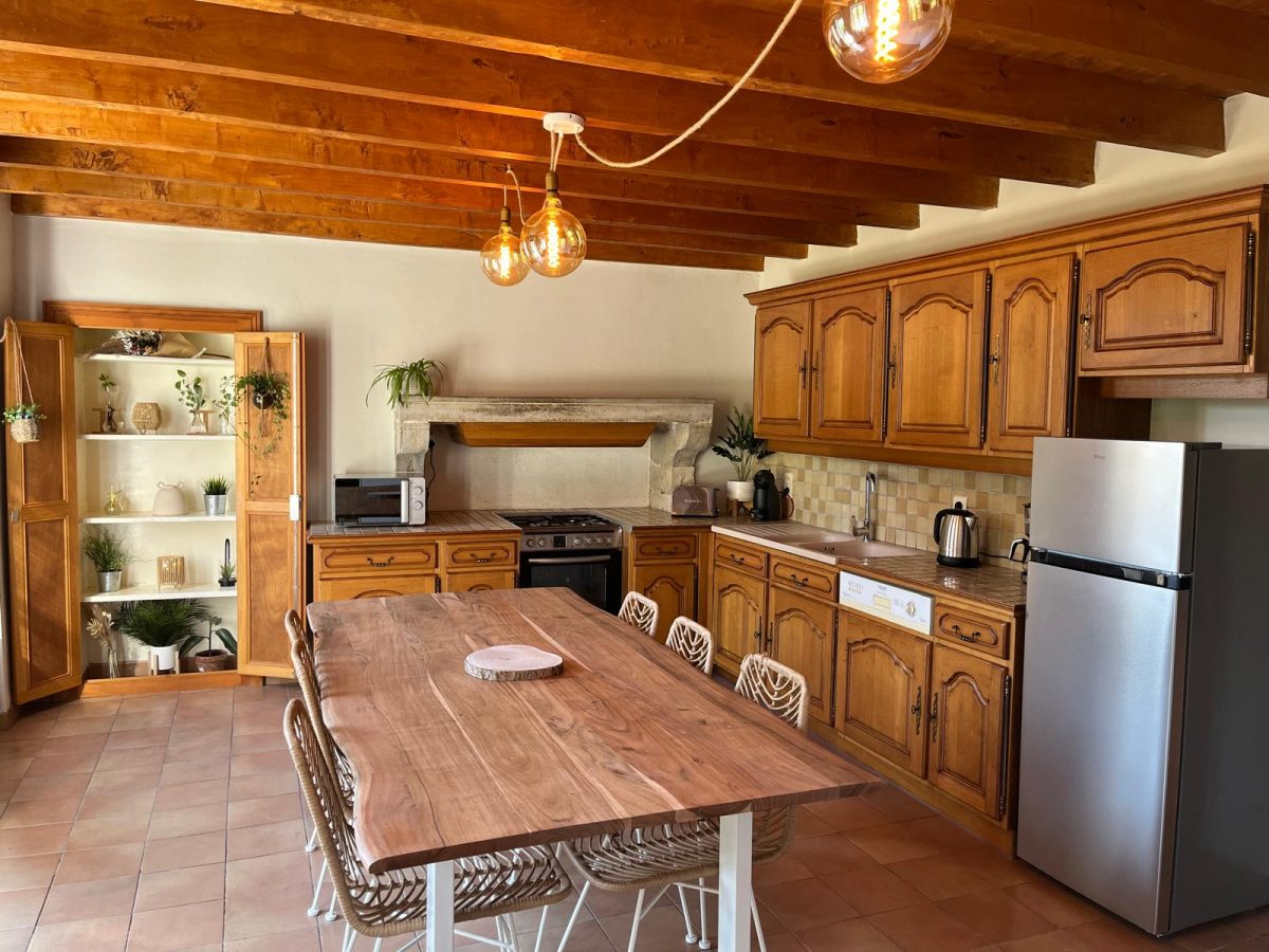 A fully equipped traditional kitchen with its dining table that can accommodate 8 people.