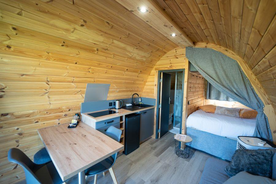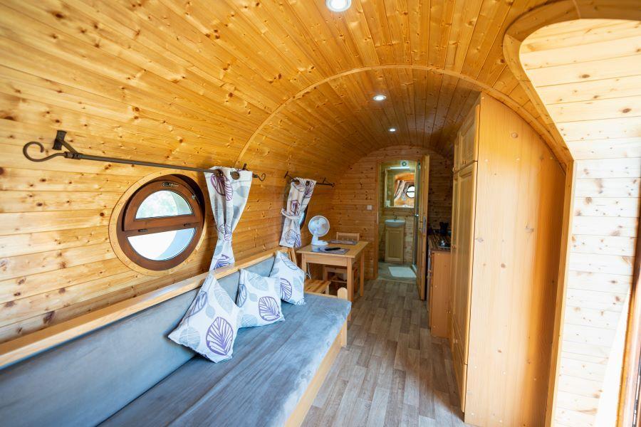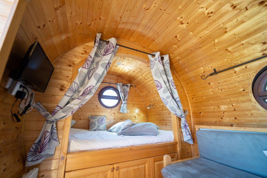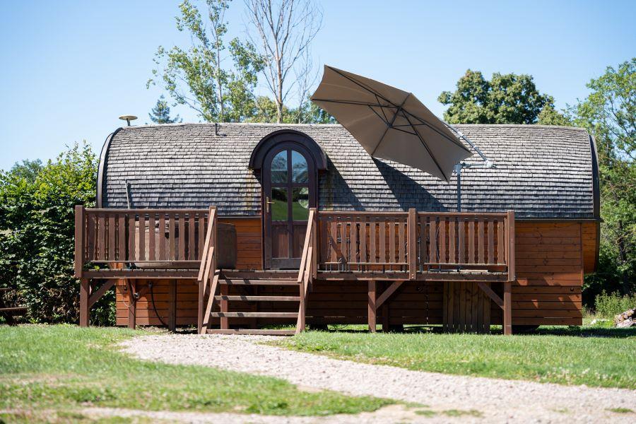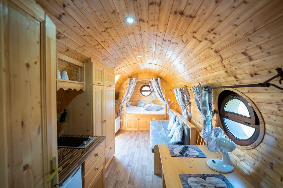 Come and discover a new unusual accommodation in Auvergne, “le Tonneau de Bois” with its chestnut tile roof, its gutters and gutters all made of copper. Opt for this intimate and cozy setting with a large bathroom and a magnificent Italian-style white tiled shower, all in a cozy atmosphere for a romantic getaway in Auvergne. Le Tonneau de Bois is equipped with an alcove bed for 2 people, 1 sofa bed + 1 trundle child bed, a bathroom with toilet, a dining room, a kitchenette and a large outdoor wooden terrace. All the modern comforts in accommodation that will mark your memories of the nights spent inside! You can relax in the private hot tub on the terrace of our Tonneau. A moment suspended in a haven of peace is offered to you! Shared covered and heated swimming pool (from 05/15 to 09/15) measuring 10 meters by 5 meters with a depth of 1.33m. The advantages of the cottage: Relax, everything is included! Sheets provided and beds made, bathroom linen included. Electricity and heating included. Possibility of Massothermy, prices to be seen on site with the owner. Don't wait any longer to try the adventure!